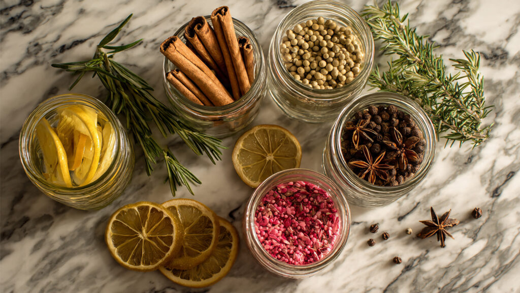 Para que as especiarias realmente “entreguem” sabor, nunca as jogue inteiras na taça sem preparo. Pressione levemente as bagas de zimbro com um pilão antes de colocar no copo e use um isqueiro para tostar rapidamente a guarnição de alecrim ou canela. Isso libera os óleos voláteis e garante um aroma profissional instantâneo.