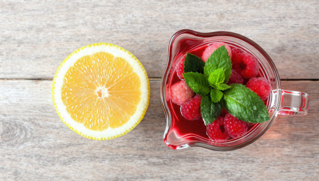3 - Misture a Base: Em uma jarra grande, coloque o suco de limão siciliano e o xarope de framboesa já frio.