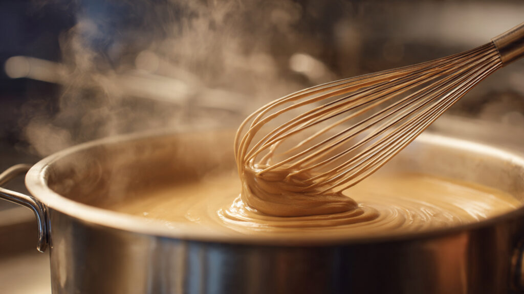 Leve ao fogo médio, mexendo sempre com um fouet (batedor de arame). O movimento constante é crucial para garantir a aeração e evitar que o fundo queime. Quando o creme começar a engrossar, adicione o café solúvel concentrado e a baunilha. Cozinhe por mais 3 minutos após a fervura para cozinhar o amido completamente.